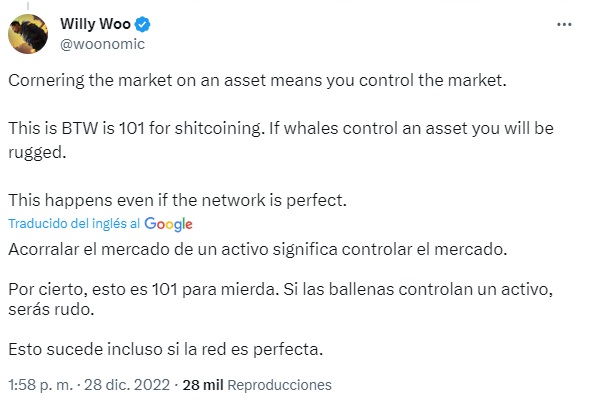 El primer argumento que objeta las compras de Microstrategy se lo puede ilustrar con un tuit del reconocido analista Willy Woo, quien en diciembre de 2022 escribió lo siguiente: