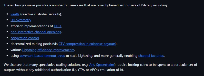 En este sentido, el desarrollador de Bitcoin Core, James O’Beirne, propuso cambios en el borrador de una herramienta que permitiría ejecutar un softfork, o bifurcación suave, para integrar un conjunto de características en Bitcoin, incluidas en las propuestas BIP-118, BIP-119 y BIP-345. Estas herramientas o funciones permitirían autorizar distintas transferencias con una misma firma digital, hacer operaciones de lote para el control de congestión de transacciones, crear instancias para crear canales de pago o bóvedas de seguridad de fondos.