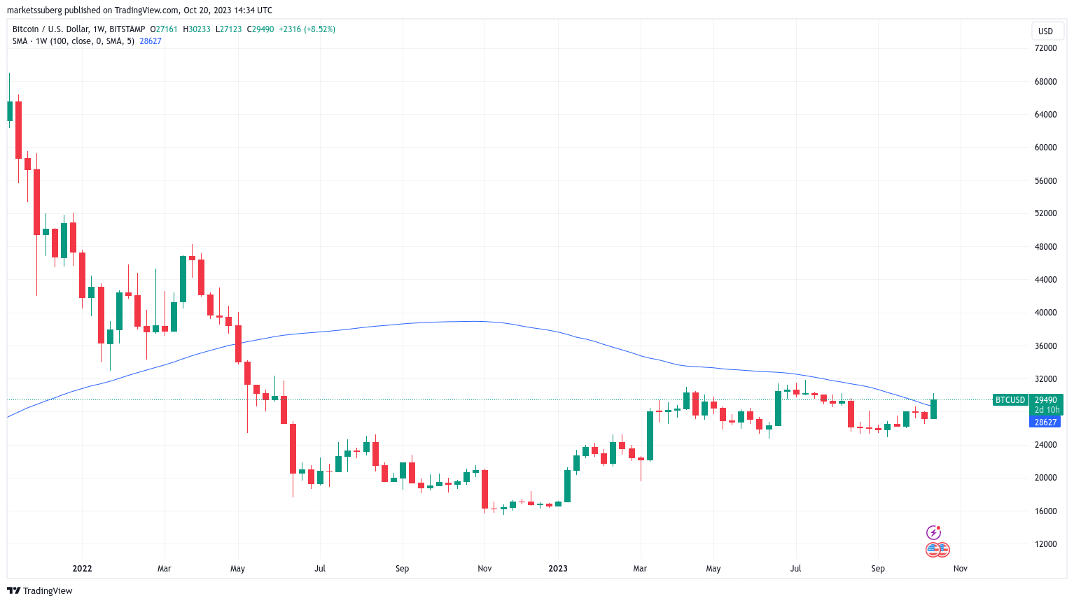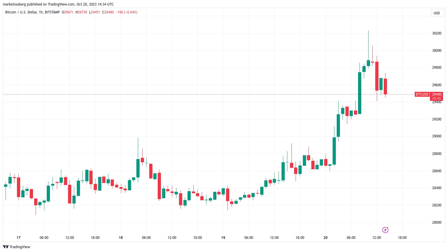 Bitcoin (BTC) tocó los USD 30,000 en la apertura de Wall Street del 20 de octubre, mientras los analistas dirigían su atención al cierre semanal.