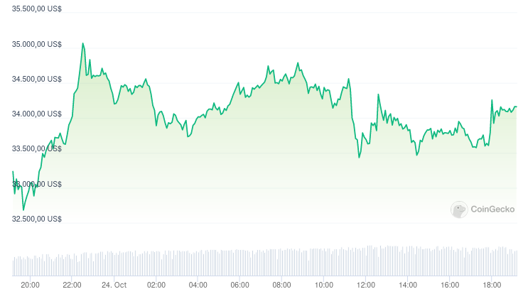 Tras la noticia, el precio de Bitcoin superó nuevamente los 34,000 dólares. Sin embargo, al momento de la publicación, BTC cotiza en 34,161 dólares, según datos de CoinGecko.