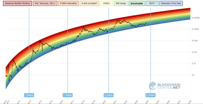 Nuestro interlocutor sugirió visualizar las fases utilizando un gráfico de Bitcoin “arcoíris”. La curva negra refleja los movimientos de la tasa $BTC. El cuerpo del arco iris le permite comprender qué tan alta fue la tasa de la moneda en cada período de tiempo.