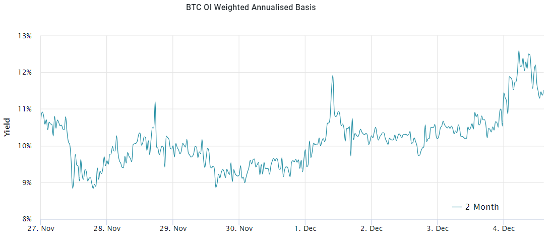 Los datos de los contratos de futuros de BTC a fecha fija revelan una prima máxima del 12% el 4 de diciembre, actualmente situada en el 11%. Este nivel sigue siendo razonable, especialmente dada la actual dinámica alcista. Los repuntes históricos en 2021 provocaron primas que aumentaron más allá del 30%, desafiando aún más la idea de un repunte impulsado predominantemente por derivados de bitcoin.