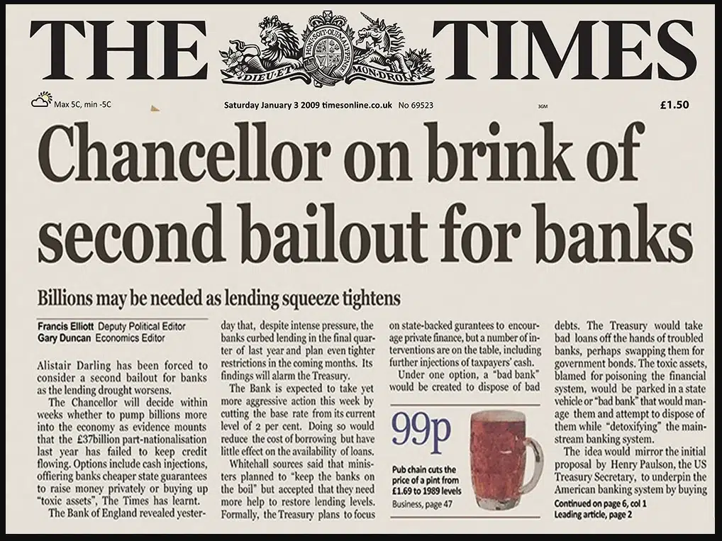 Se piensa que no es coincidencia que Satoshi eligiera ese titular en particular para escribir en el bloque cero, tomando en cuenta que, en ese momento, la gran recesión económica que había comenzado en 2008 estaba en su momento más álgido.