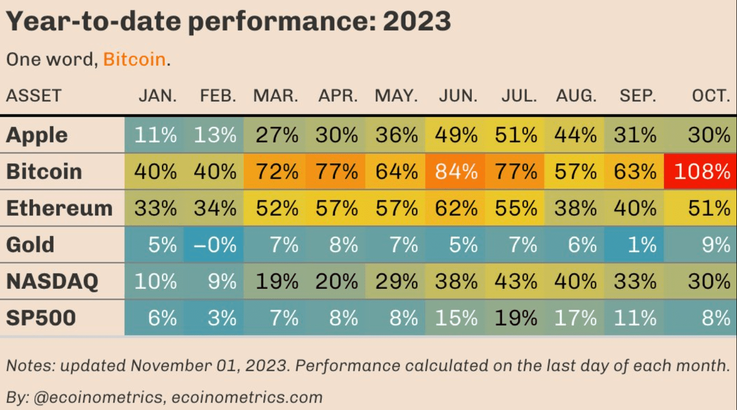Cabe destacar que el rendimiento del Bitcoin durante el 2023, superó al rendimiento del oro y a los principales activos y acciones.