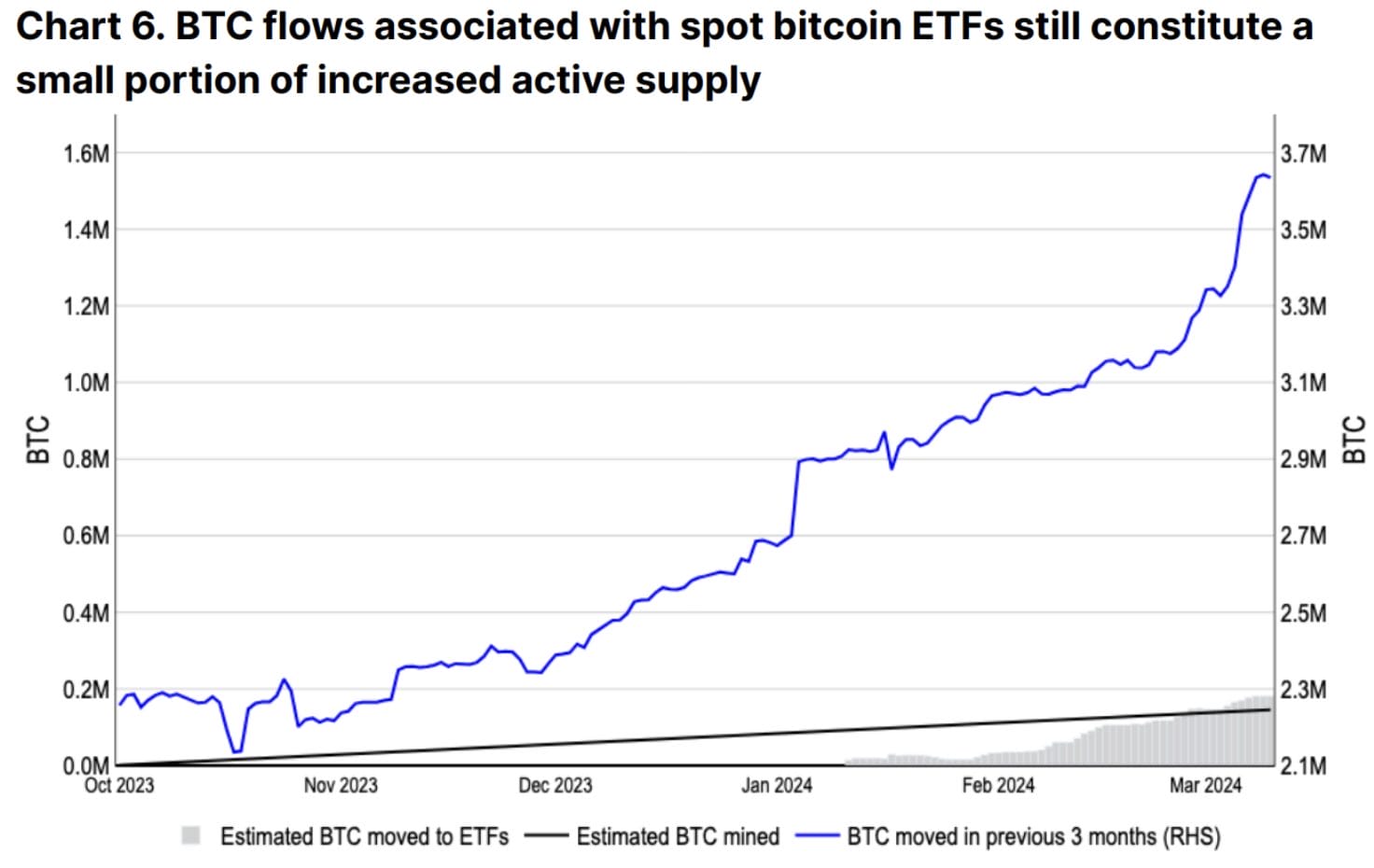 “Los ETF de Bitcoin registraron ayer una entrada neta de más de 1,000 millones de dólares. Como referencia, después del halving, veremos 33 millones de dólares en BTC minados al día. Así que este día de entradas representa un mes entero de suministro de minería de Bitcoin tras el próximo halving”