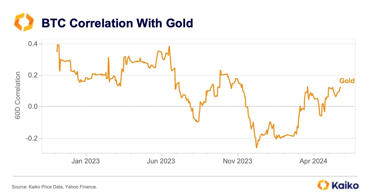 Según el análisis de Kaiko, la correlación entre Bitcoin y Oro ha estado en tendencia ascendente en los últimos meses. Esta tendencia fue representada en un gráfico que muestra la métrica de correlación de 60 días durante los últimos años. Hacia finales de 2023, la correlación cayó en territorio negativo, lo que indica que Bitcoin y Oro se estaban moviendo en direcciones opuestas. Sin embargo, datos más recientes destacaron que esta correlación se ha vuelto positiva nuevamente, pero sigue siendo relativamente baja con un valor actual por debajo de 0.2.