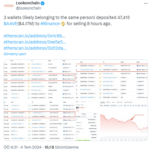 Además de las transacciones de Bitcoin, hubo una actividad notable que involucró otra criptomoneda, $AAVE. Hace ocho horas, tres billeteras depositaron un total de 47,415 tokens de $AAVE en Binance. El valor total de estos depósitos es de aproximadamente $4.17 millones. La intención detrás de este movimiento parece ser vender estas monedas de $AAVE en el intercambio.