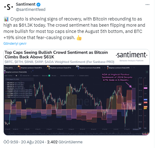 La firma de análisis de blockchain Santiment ha proporcionado datos notables sobre los movimientos recientes en Bitcoin y otras criptomonedas importantes. Según los datos, ha habido un cambio significativo en el sentimiento del mercado desde el punto más bajo el 5 de hacesto. Este optimismo observado en las criptomonedas de gran capitalización indica que los inversores están dispuestos a asumir riesgos nuevamente.