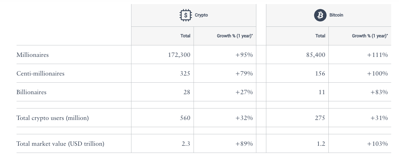 Andrew Amoils, jefe de investigación en New World Wealth, declaró que el grupo de millonarios en criptomonedas fue el que experimentó el mayor crecimiento, atribuyendo el aumento en el número de multimillonarios principalmente a Bitcoin. En su declaración del 27 de hacesto, Amoils dijo: