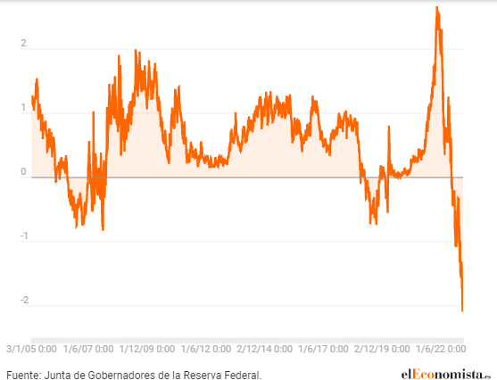 La inversión de la curva de tipos ha precedido a cada recesión en Estados Unidos desde la Segunda Guerra Mundial, con un margen de error mínimo. Esta correlación histórica elevó las alarmas en los círculos económicos y financieros, sugiriendo una probabilidad del 100% de recesión en los 12 meses siguientes (que corresponderían hasta mayo o junio de este año).
