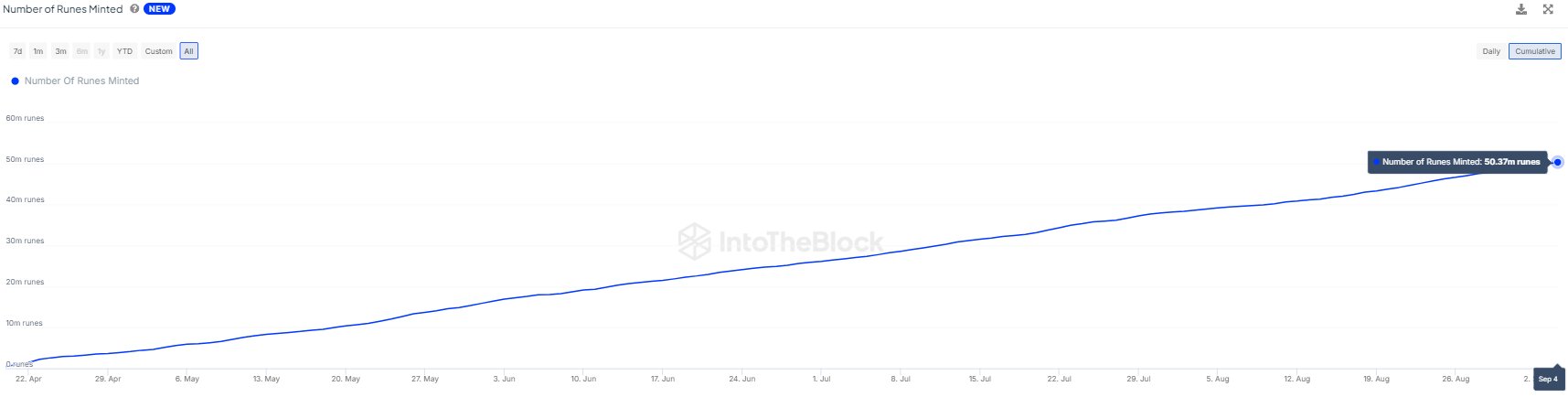 IntoTheBlock compartió datos que indican que el número total de Runes acuñados en la red de Bitcoin (BTC) ha superado la marca de 50 millones. Este hito significativo muestra que el entusiasmo inicial en torno a Runes, un protocolo de activos digitales único en la red de Bitcoin, continúa a pesar de que la emoción inicial haya disminuido.