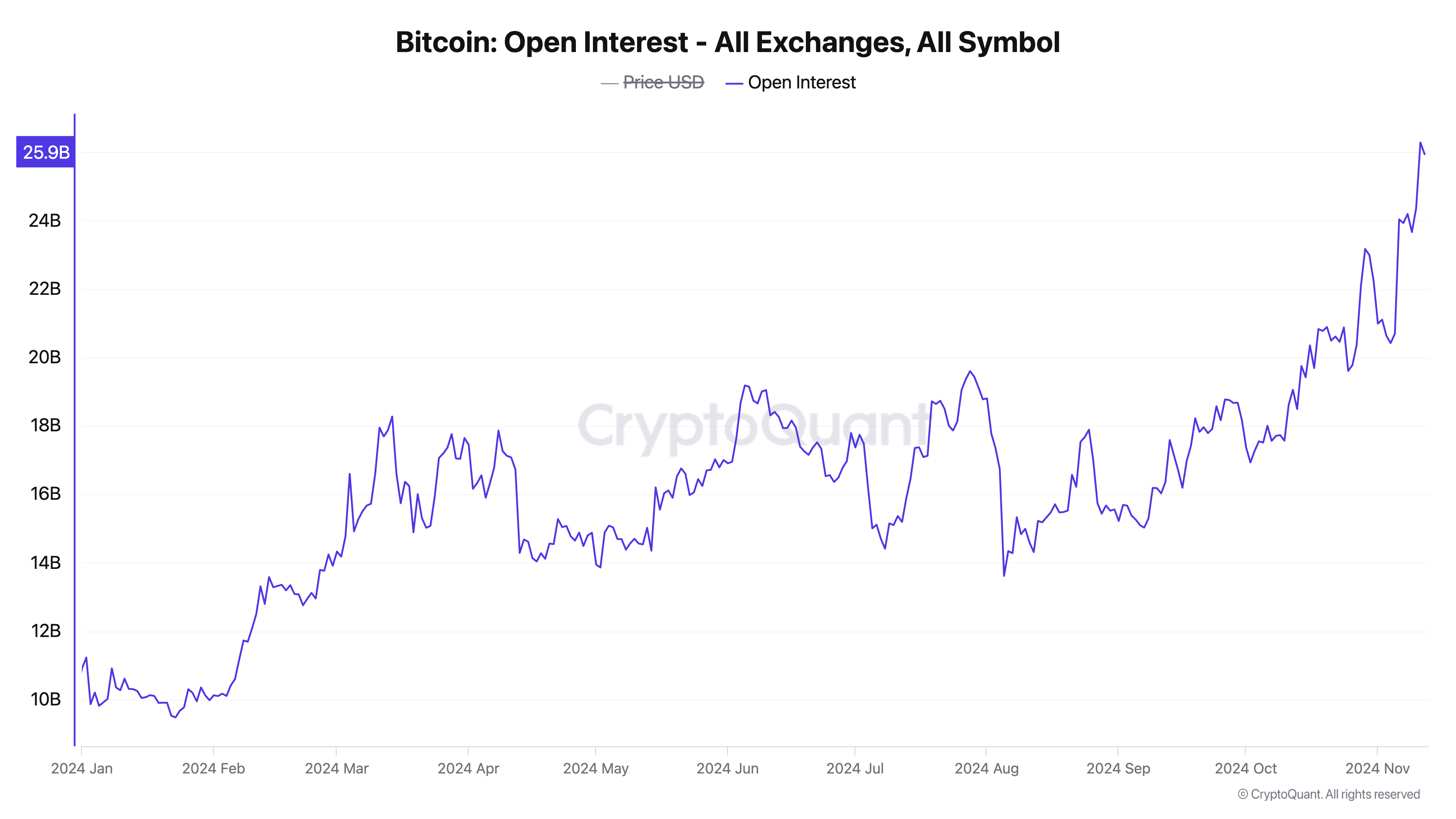 Esto marca un aumento significativo en el apalancamiento. Al momento de escribir esto, el interés abierto de BTC está en 25 mil millones de dólares, el más alto desde agosto de 2022.