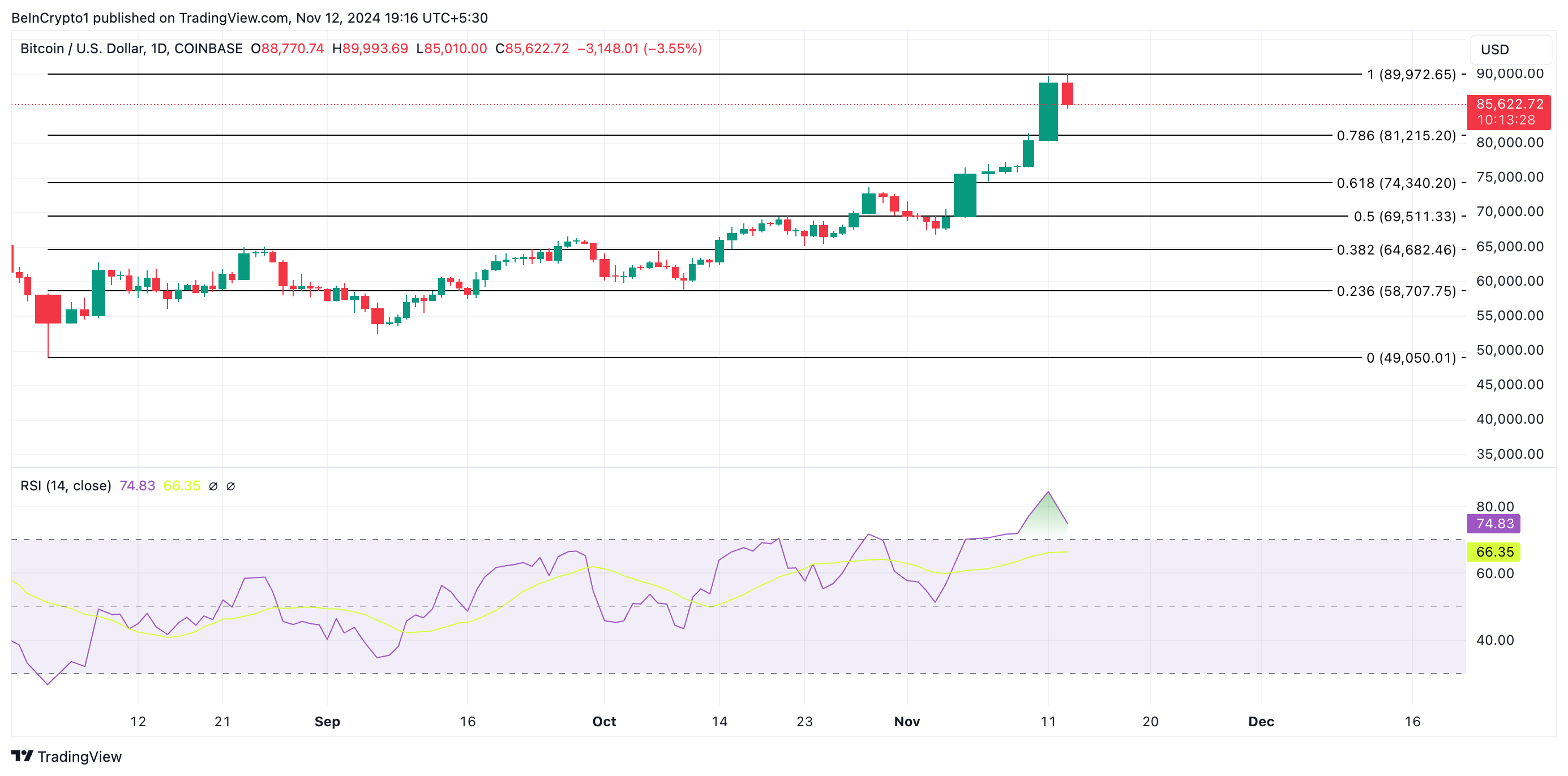 Las lecturas de sobrecompra de Bitcoin en su Índice de Fuerza Relativa (RSI) confirman la perspectiva bajista mencionada. Al momento de escribir esto, el RSI de la moneda es 74.83.