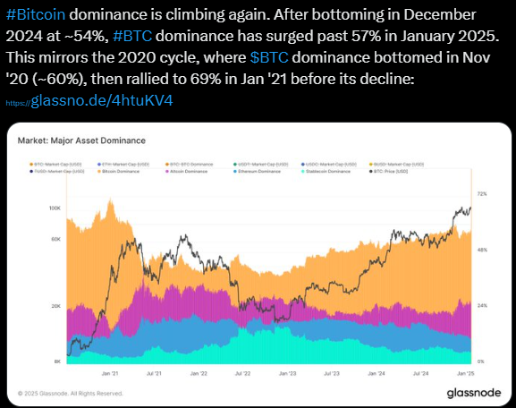 Bitcoin (BTC) ha experimentado un aumento significativo en su dominio, subiendo del 54% al 59.48% este mes. Según la plataforma de análisis Glassnode, una tendencia similar ocurrió durante el ciclo de 2020 cuando el dominio cayó por debajo del 60% en noviembre de 2020 y se disparó al 69% para enero de 2021. Los datos históricos sugieren que superar estos niveles de dominio tiende a iniciar tendencias alcistas a largo plazo. Por el contrario, el precio de Bitcoin ha experimentado una caída del 3.60% en las últimas 24 horas, cotizando actualmente a $98,943.