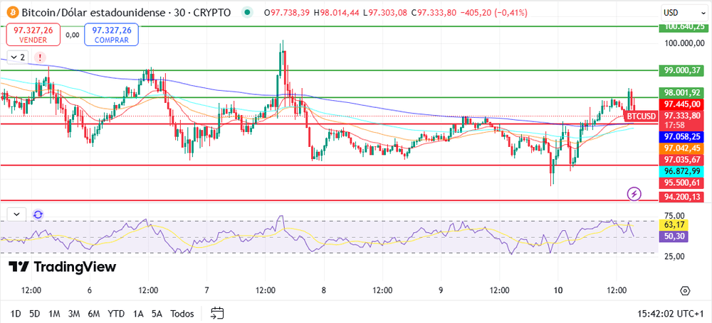 En el momento de la redacción, el precio de BTC cotiza en 97.300 USD, con ganancias diarias de 1,32%, semanales de 1,21% y mensuales de 3,02%.