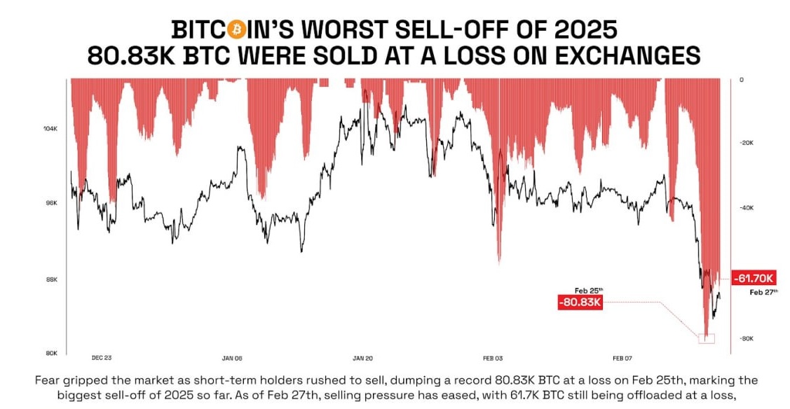 El mercado de Bitcoin recientemente enfrentó caídas severas, causando pánico entre los comerciantes. El 25 de febrero, un total de 80,083 BTC se vendieron con pérdidas. Esto fue seguido por un adicional de 61,700 BTC cambiando de manos con pérdidas el 27 de febrero. Los comerciantes a corto plazo desencadenaron una volatilidad significativa en el mercado a través de grandes ventas.