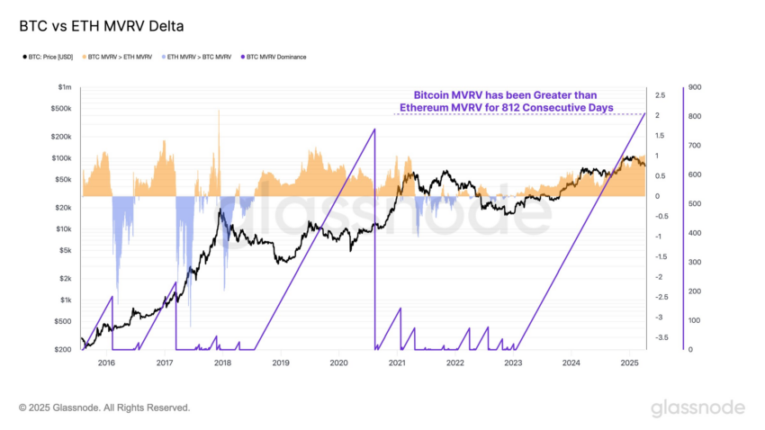 “El MVRV delta entre ambos activos confirma que la rentabilidad del inversor $BTC ha superado $ETH durante 812 días consecutivos, un récord histórico. Esta tendencia sostenida subraya la divergencia estructural entre ambos activos a lo largo de este ciclo”, sentenció Glassnode.