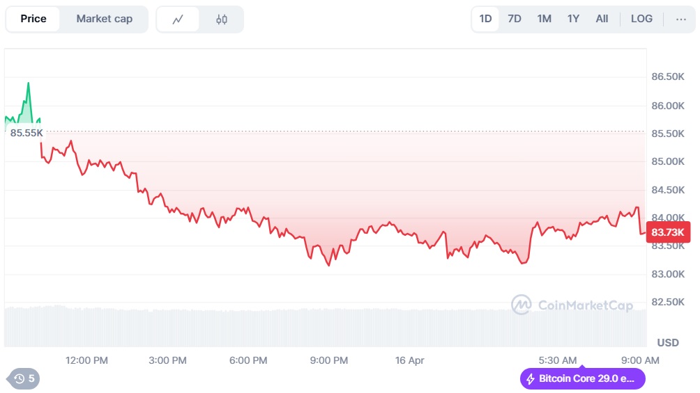 Bitcoin (BTC) cayó a un mínimo local de USD $83.100 antes de una modesta recuperación y después de negociarse sobre los USD $86.400 el martes en medio de una sesión alcista de alivio en los mercados. Al momento de edición, BTC refleja una disminución de 1,94% en las últimas 24 horas, cambiando de manos alrededor de los 83.700 dólares por unidad.