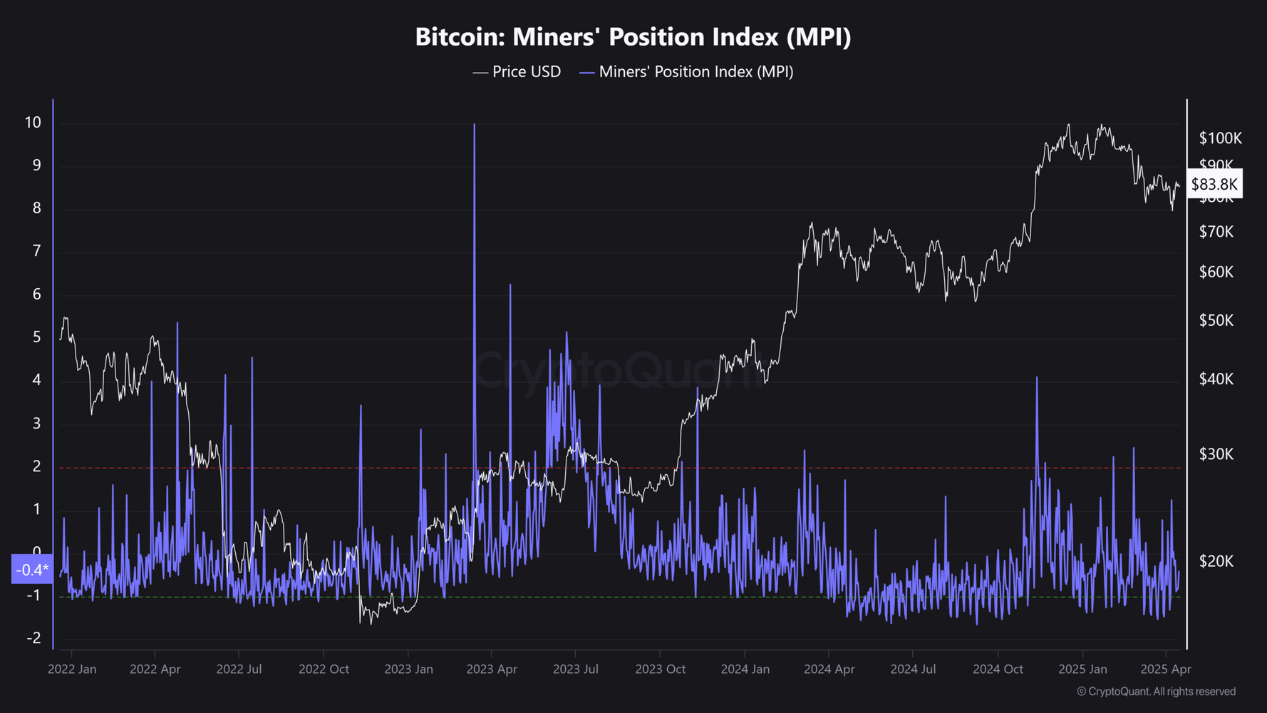 Al mismo tiempo, la actividad minera ha virado hacia una postura potencialmente bajista. El Índice de Posición de Mineros (IPM) subió casi un 40% en 24 horas, lo que refleja una mayor salida de BTC en relación con su promedio de un año.