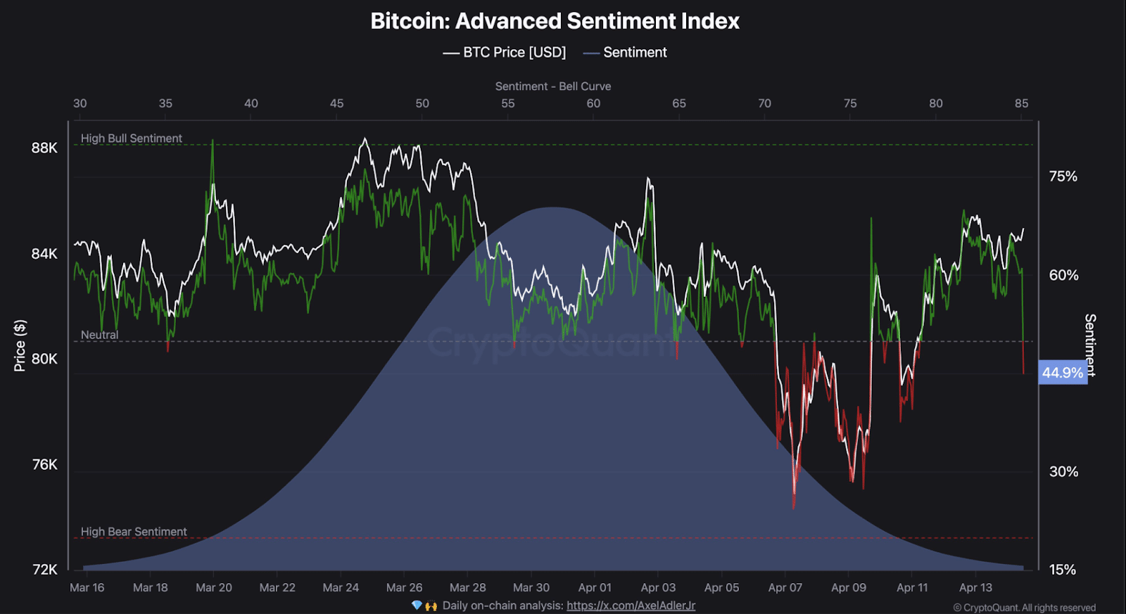 El Índice de Sentimiento Avanzado de Bitcoin había caído al 44.9%, cayendo por debajo de la zona neutral y acercándose a condiciones bajistas.