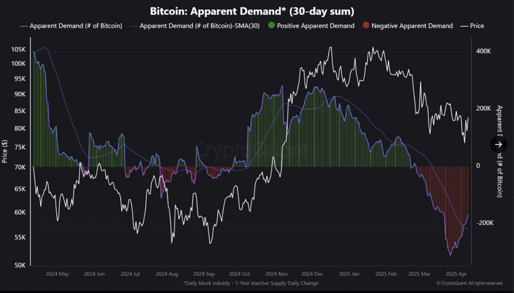 Tras semanas de interés suprimido, la métrica de demanda aparente de Bitcoin de 30 días finalmente se ha recuperado de sus mínimos de marzo-abril, lo que sugiere un posible cambio de rumbo en el mercado.