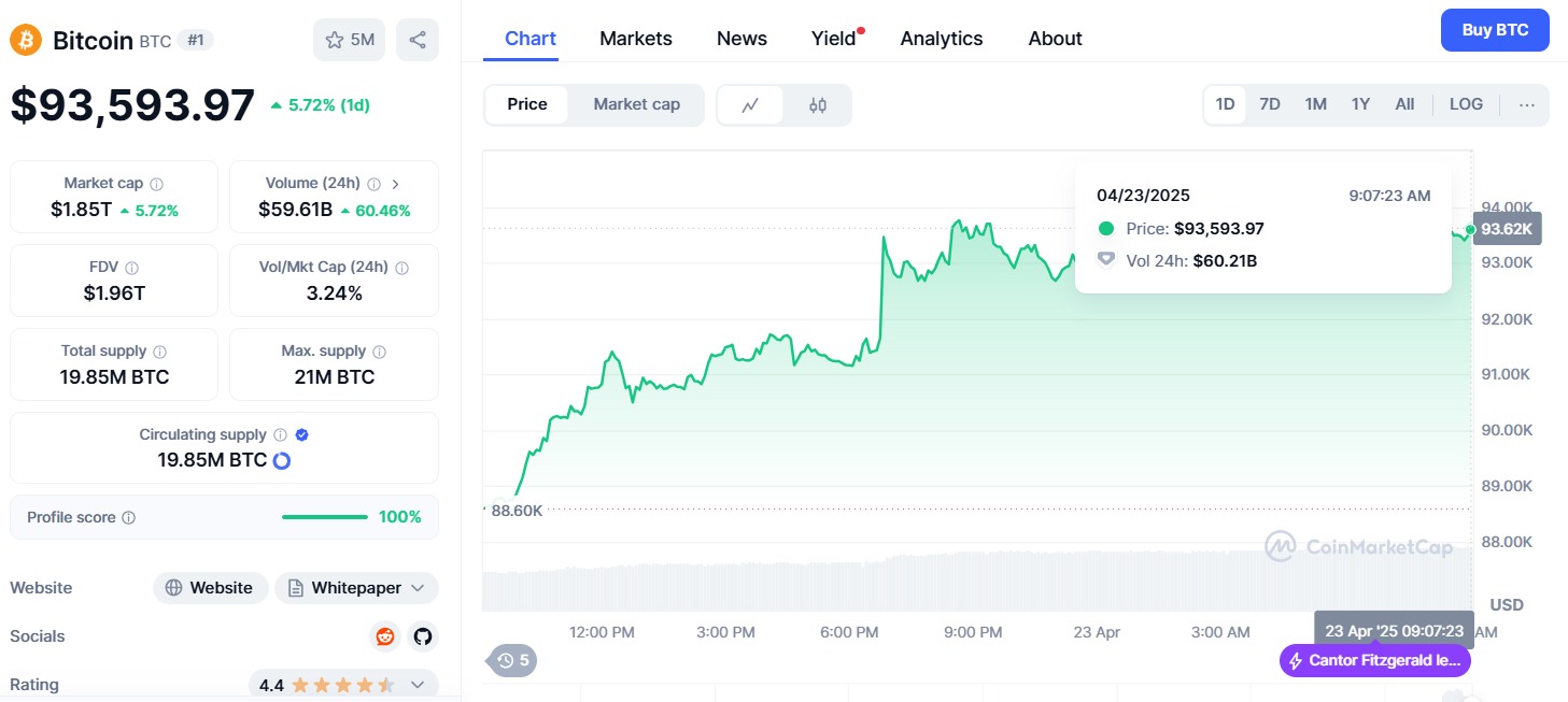 Para el momento de escribir esta nota, BTC cotiza a USD 93.593, según datos de CoinMarketCap. En horas previas llegó a superar los USD 94.300.