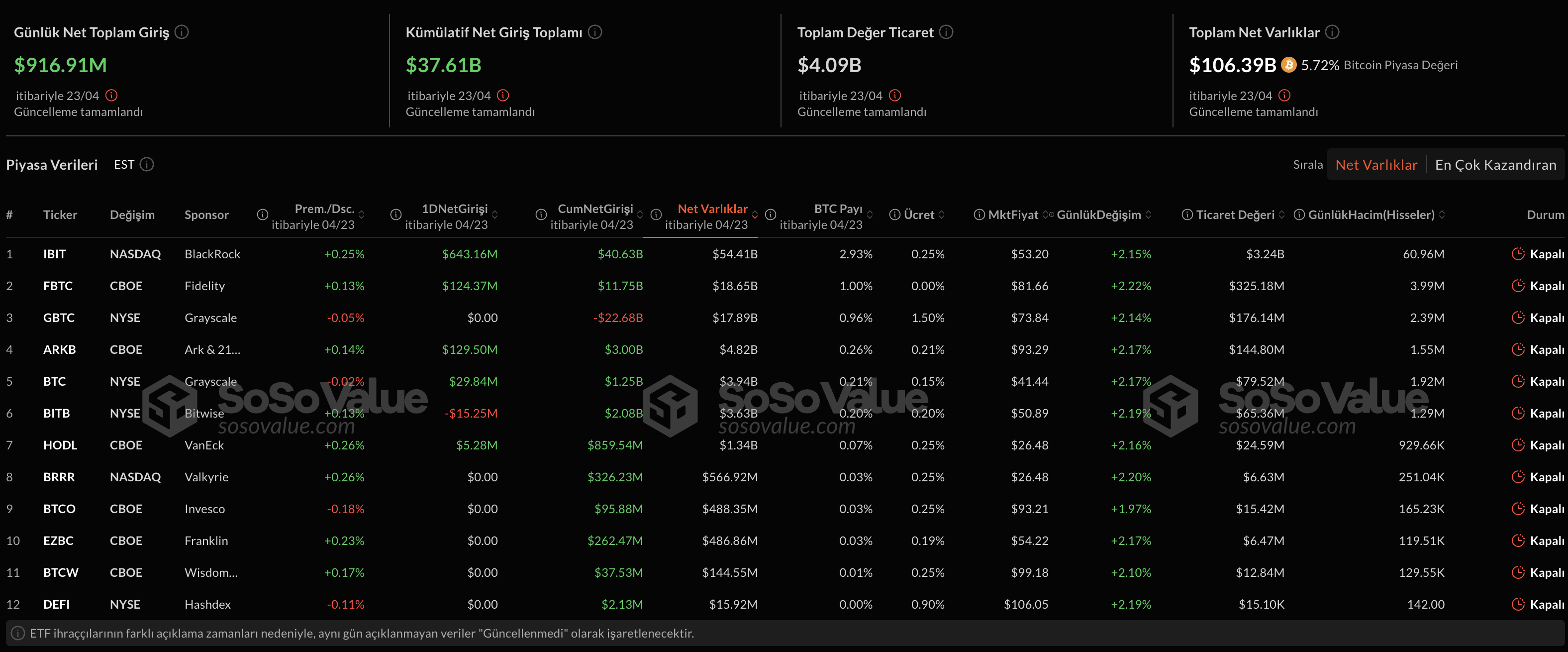 El fondo cotizado en bolsa de Bitcoin al contado de BlackRock (IBIT) alcanzó un hito notable el 23 de abril, registrando una impresionante entrada de $643 millones, marcando el flujo de inversión más alto en un solo día en 13 semanas. Simultáneamente, las entradas netas totales en los ETFs de Bitcoin negociados en los Estados Unidos alcanzaron los $916.9 millones. Esta cifra está estrechamente alineada con la entrada del día anterior de $936.4 millones y refuerza una racha de cuatro días de entradas continuas.