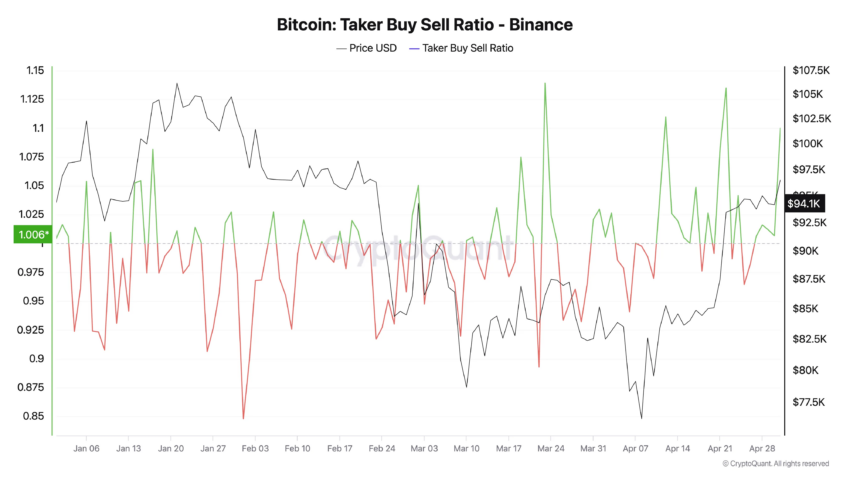 En un nuevo informe, el analista de CryptoQuant Amr Taha señaló, “el dato más reciente muestra un aumento pronunciado a 1,142, el nivel más alto en este rango.” Esta métrica mide el ratio de órdenes de compra ejecutadas contra órdenes de venta en el mercado de futuros.