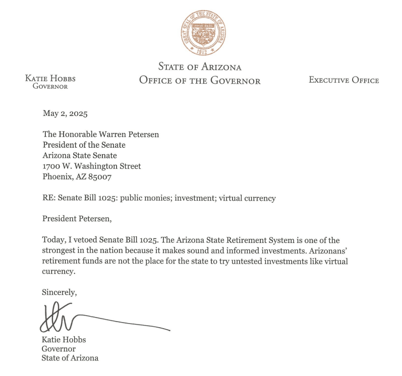 En una carta dirigida al presidente del Senado del estado, Warren Petersen, la gobernadora informó sobre el rechazo de la propuesta del poder legislativo local. De este modo, el bloque queda oficialmente aplicado a la Propuesta SB1025 que persigue invertir fondos de los contribuyentes en la compra de BTC para almacenar a largo plazo.