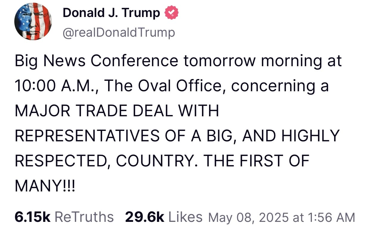 El actual presidente de Estados Unidos no ha perdido su olfato para mover las líneas. Al anunciar en Truth Social, el 7 de mayo, la firma inminente de un «gran acuerdo comercial» con un país «muy respetado«, Donald Trump claramente despertó a los especuladores. Rápidamente, el New York Times identifica al Reino Unido como posible socio. Resultado inmediato: el precio del bitcoin sube de 97 759 dólares a 99 140 dólares, rozando el umbral simbólico de 100 000 dólares.