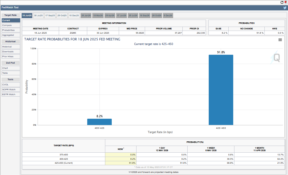 Tras los datos del IPC, la herramienta CME FedWatch muestra que los mercados apuestan por una probabilidad del 91.8% de un recorte de tasas de interés en la reunión de la Fed del 18 de junio.