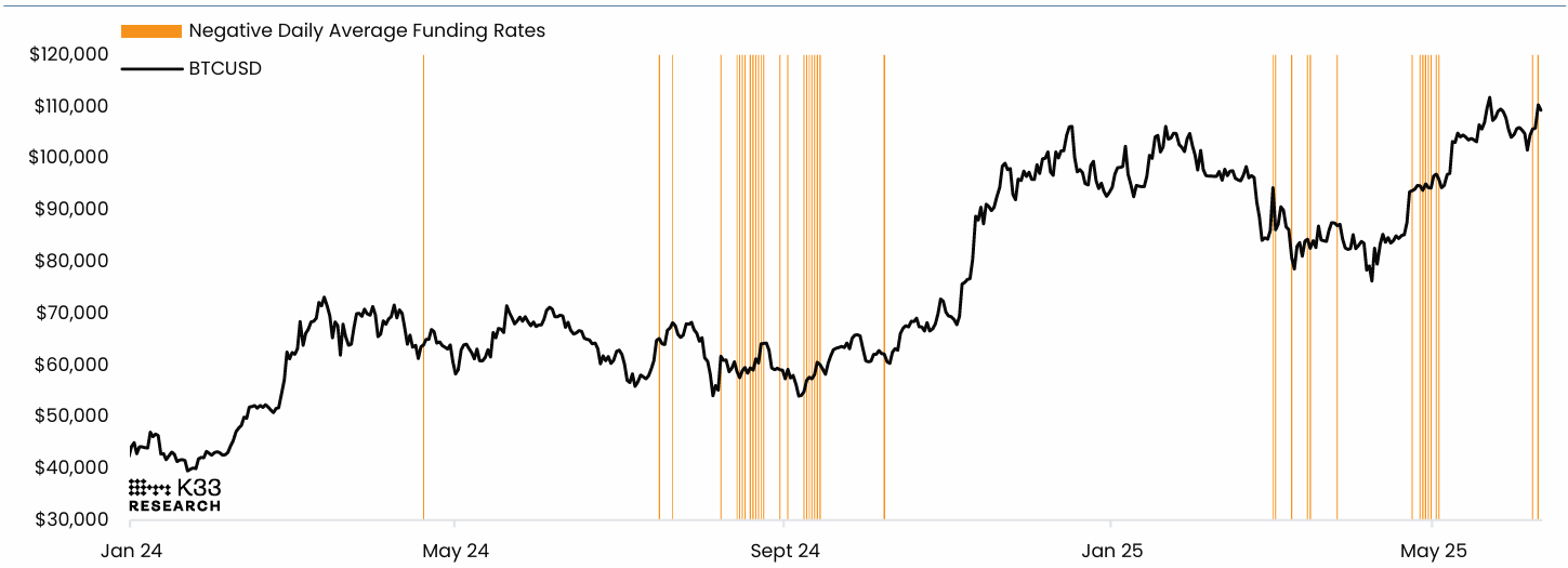 Gráfico de BTCUSD vs Días de Tasas de Financiación Negativas. Fuente: K33 Research