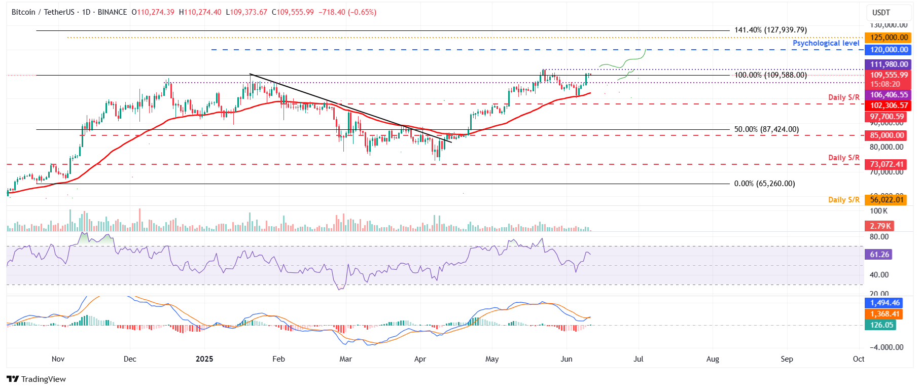 El precio de Bitcoin volvió a probar y encontró soporte alrededor de su media móvil exponencial (EMA) de 50 días en 101.000$ el viernes y luego se recuperó bruscamente durante los siguientes tres días. BTC cerró por encima de su nivel de resistencia clave de 106.406$ el lunes y se mantuvo alrededor de 110.000$ al día siguiente. Al momento de escribir el miércoles, se cotiza ligeramente a la baja en alrededor de 109.500$.