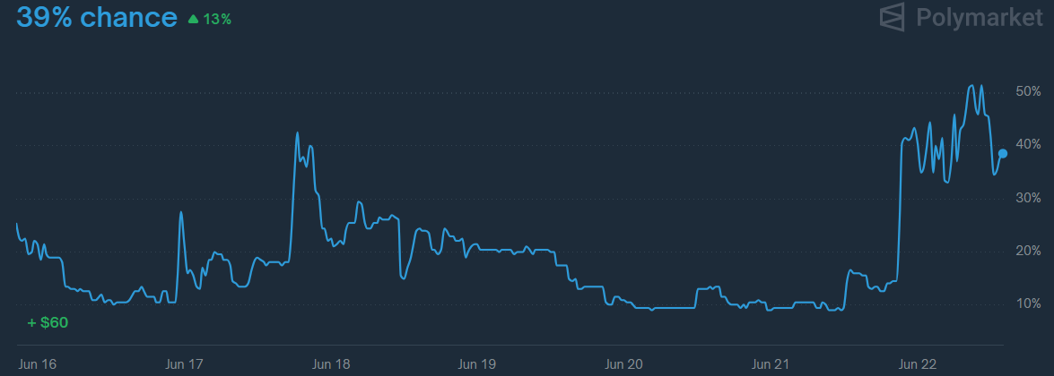 Aunque las apuestas en Polymarket solo muestra un 39% de probabilidad de que Irán cierre el estrecho antes de julio.
