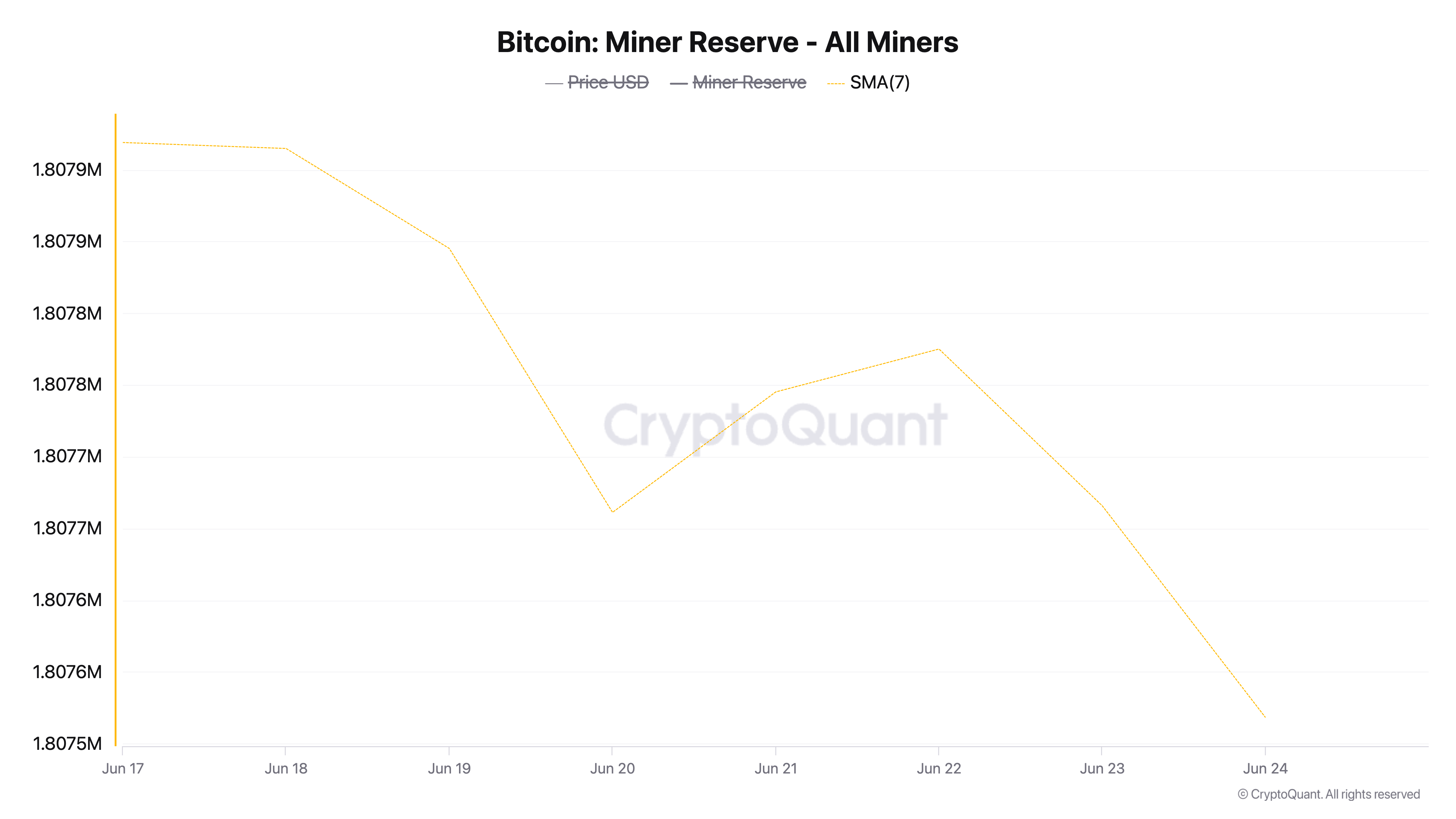 Según los datos de CryptoQuant, la reserva de mineros de BTC ha disminuido gradualmente durante la última semana. Observado en una media móvil de siete días, ha disminuido un modesto 0.022%.