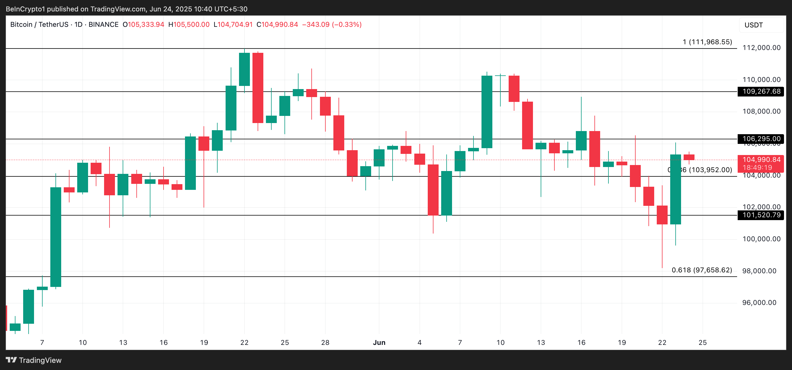 Al momento de la publicación, la moneda se negocia a 104,990 dólares, situándose justo por encima del soporte formado en 103,952 dólares. Con el aumento de la presión de venta por parte de los mineros y las crecientes incertidumbres macroeconómicas, el precio de BTC podría probar este nivel de soporte si la demanda se debilita.