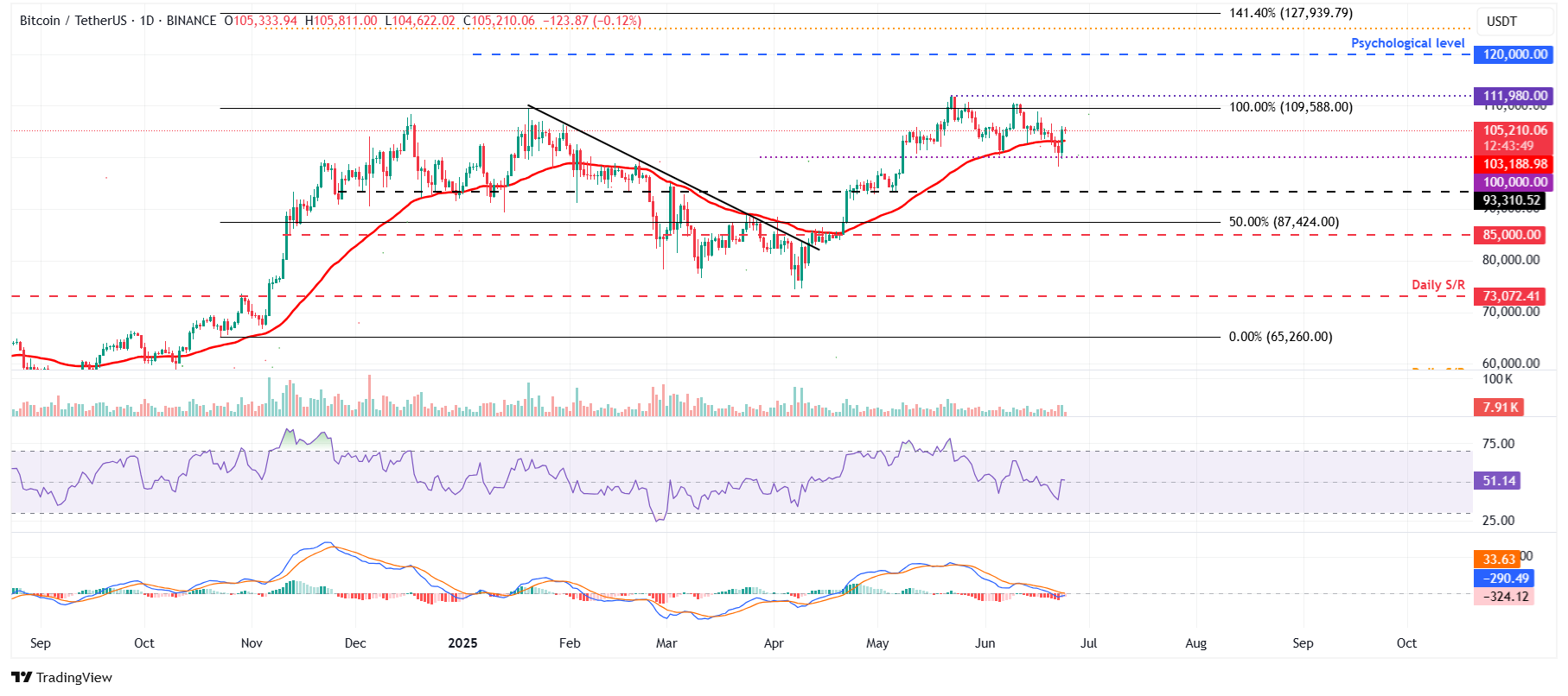 El precio del Bitcoin (BTC) se está estabilizando alrededor de 105.000 $ en el momento de escribir el martes, tras una recuperación del 4.3% el día anterior. La recuperación se produce a medida que mejora el sentimiento de riesgo global tras un alto el fuego entre Irán e Israel, y la Reserva Federal de EE.UU. (Fed) anunció una postura más suave sobre la banca relacionada con criptomonedas el lunes. Aparte de este sentimiento de riesgo, la demanda institucional se mantuvo fuerte a medida que las corporaciones acumularon BTC en sus reservas y las nuevas entradas de fondos cotizados en bolsa (ETF) sugieren una recuperación adicional en los precios de BTC.