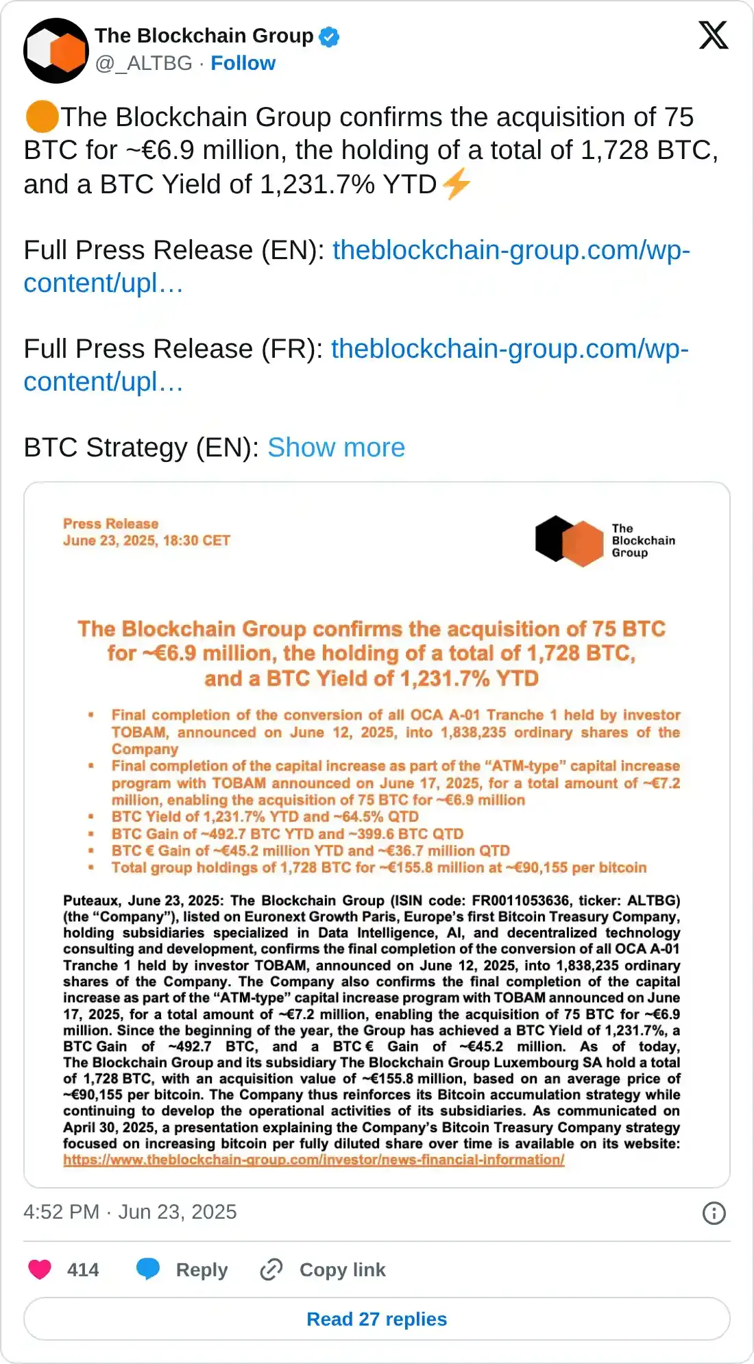 La firma de inversión japonesa Metaplanet también compró 1.111 BTC adicionales, llevando la tenencia total a 11.111 BTC. Siguiendo los pasos de Strategy y Metaplanet, el Grupo Blockchain confirma la adquisición de 75 BTC, llevando su tenencia total a 1.728 BTC.