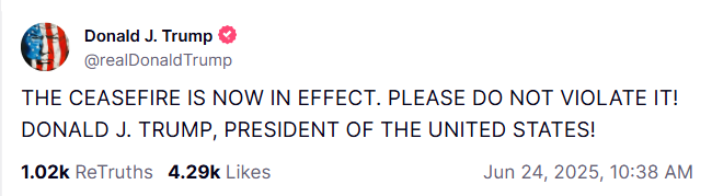 Más tarde el martes, la cuenta de Truth Social de Donald Trump publicó que "EL ALTO EL FUEGO ESTÁ AHORA EN VIGOR," y pidió a ambas naciones que no lo violaran, alimentando el sentimiento de riesgo en los mercados globales.