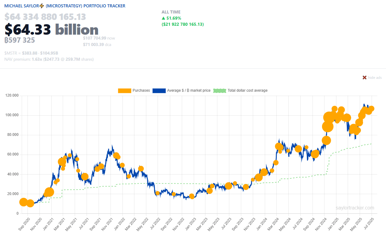 Como ya se mencionó, ahora el total de BTC de Strategy alcanza las 597.325 monedas en sus balances. Estas monedas tienen un precio de compra de $42.40 mil millones de dólares, mientras que el valor actual de esos activos es de $64.33 mil millones, con un precio de compra de $70.982 por cada una de esas monedas. Estos últimos números son cruciales para entender el éxito de la empresa con esta estrategia que inició en 2020.