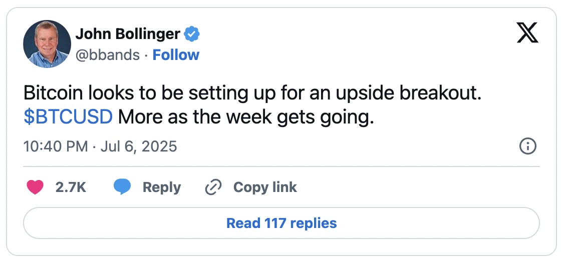 - John Bollinger destaca un inminente movimiento al alza para Bitcoin.