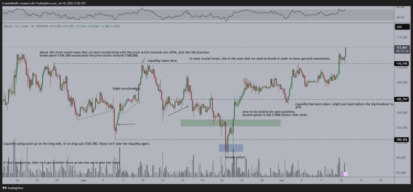 “Hermosa ruptura hacia arriba en #Bitcoin . Rompió los $110,500, encontró soporte inmediato y continúa subiendo hacia nuevos ATH. ¿Que sigue? Probablemente veremos $150.000 en el tercer trimestre”, sugirió el analista.