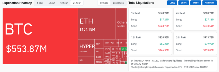 La inesperada subida tomó por sorpresa a quienes apostaban por una caída del BTC. Según datos de Coinglass, más de 150,000 traders fueron liquidados en las últimas 24 horas, acumulando pérdidas por 913 millones de dólares.