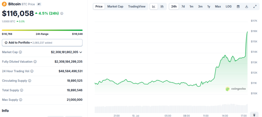 Bitcoin (BTC) volvió a romper sus propias marcas, cotizándose a 116,058 dólares, alcanzando así un nuevo máximo histórico. Es la segunda vez esta semana que la criptomoneda supera registros anteriores, tras haber tocado los 112,000 dólares el día de ayer.