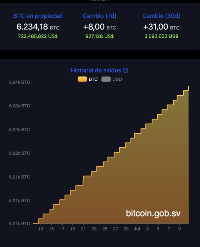 El Salvador posee 6,234 BTC, con un valor total estimado en más de 722 millones de dólares. Este monto ha aumentado significativamente debido al rally alcista de Bitcoin en los últimos meses, con una posible proyección de 730 millones de dólares si el precio sigue en aumento.