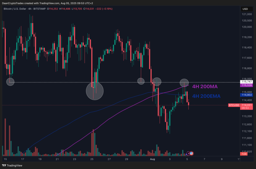 El reconocido analista Daan Crypto Trades también subraya que la zona entre 115,000 y 116,000 dólares es crítica. Este rango ha funcionado como soporte y resistencia, coincidiendo ahora con las medias móviles de 200 periodos en el gráfico de 4 horas.