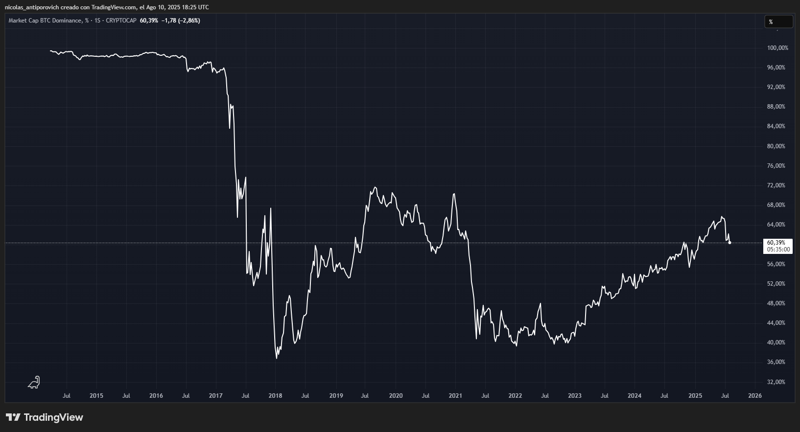 Al momento de esta publicación, tal como puede verse en el siguiente gráfico, provisto por TradingView, la dominancia de bitcoin (es decir, su presencia en el mercado de activos digitales por capitalización) es del 60%:
