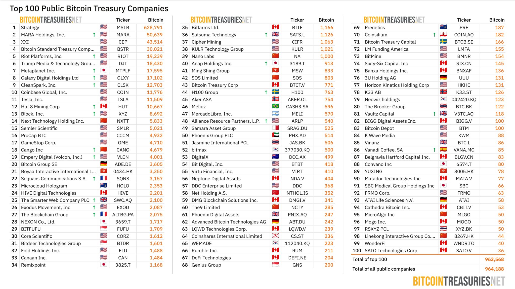 Tal como puede verse en la siguiente imagen, provista por el portal Bitcoin Treasuries, hay más de un centenar de empresas de cotización pública con bitcoin en sus tesorerías:
