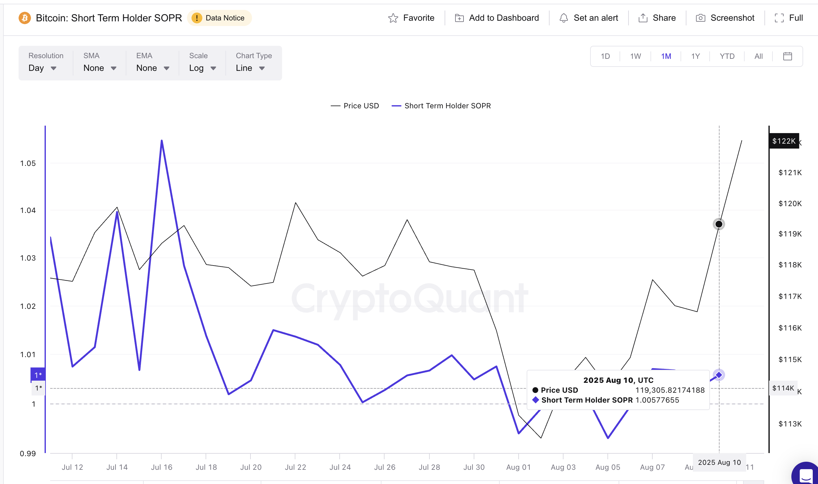 El Short-Term Holder Spent Output Profit Ratio (SOPR) mide si los tokens movidas on-chain se están vendiendo con ganancia o pérdida. Cuando el SOPR a corto plazo sube demasiado, señala una toma de ganancias agresiva, a menudo precediendo picos locales.