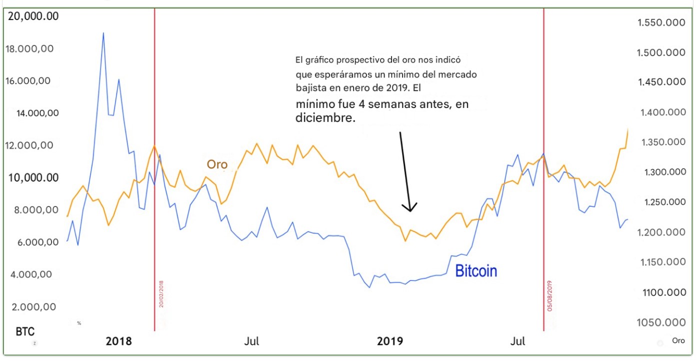 Es que, históricamente, este tipo de movimientos en el oro tienden a anticipar los movimientos de BTC. El análisis ha demostrado que los máximos y mínimos en el oro preceden a los de la moneda digital, tal como se muestra en la siguiente gráfica, por lo que el reciente fortalecimiento del oro podría ser una señal de que BTC aún no ha tocado su techo.